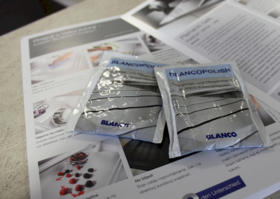 Uz prezentaciju kuhinja u Gradingu je održana i prezentacija sredstva za čišćenje BLANCO sudopera. To su sudoperi visoke kvalitete koji su odličan izbor uz svaku novu kuhinju. Sredstva za čišćenje sudopera dolaze u obliku paste i praška koji jednostavno i brzo čiste sve nečistoće i mrlje na Vašem sudoperu. Dovoljno je sudoper lagano ispolirati mokrom krpom sa malo BLANCO paste i sve mrlje i nečistoće nestaju, čak i one za koje ste mislili da ih se nikako ne možete riješiti. O sredstvima za čišćenje sudopera, kao i sudoperima proizvođača BLANCO sve detaljne informacije možete dobiti u našem prodajnom centru u Bedekovčini.