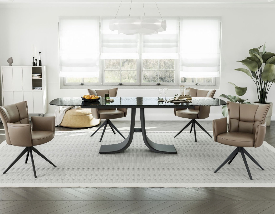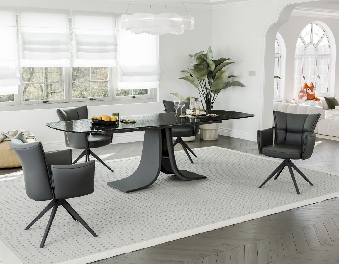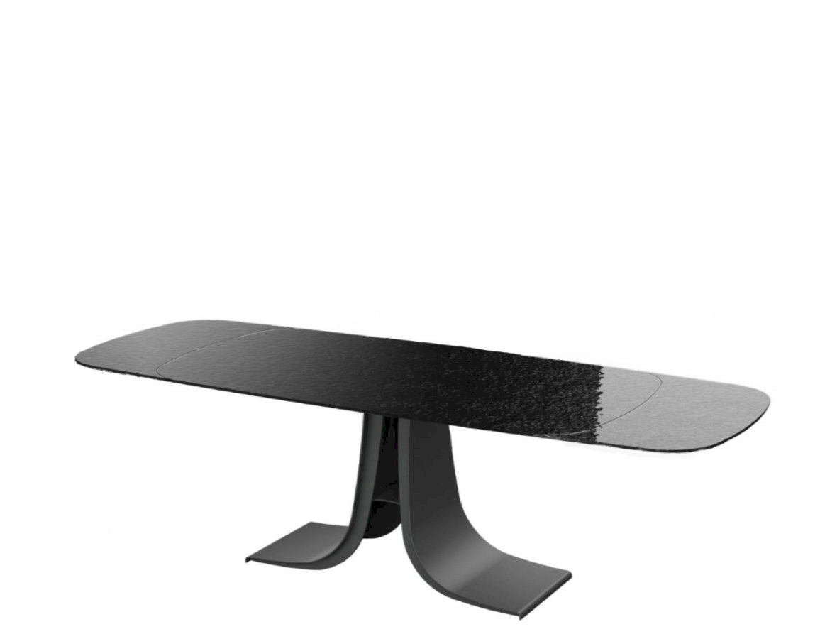 Moderan stol na razvlačenje u crnoj boji koji će odlično izgledati u vašoj blagovaonici. Ploča stola izrađena je od stakla, s ugodno zaobljenim kutovima za mekši izgled. Ploča stola ima dva produžetka od 40 cm koji se izvlače iz bočnih stranica stola i rastežu korisnu površinu ploče od 180x95 cm do 260x95 cm. Metalna baza stola, izrađena od zakrivljenih ploča u odgovarajućoj crnoj boji, premazana je prahom za bolju zaštitu okoliša.