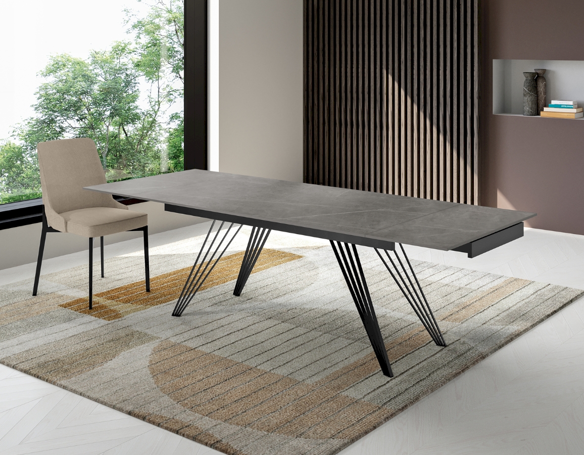 Ono što privlači pažnju je ekspresivna snaga ovog razvlačnog stola u suvremenom i industrijskom stilu. Njegov dizajn karakterizira elegantna ploča izrađena od keramike koja se ukusno kombinira s čvrstom crnom metalnom bazom. Match u svoje tri verzije nudi mnoge moguće kombinacije između završnih obrada pravokutne ploče i oblika baze, prepuštajući se osobnom izražavanju i ukusu te odražavajući duh konteksta u koji je umetnut. Zahvaljujući svojoj proširivosti, može primiti do 10 osoba i postaje savršen saveznik u stvaranju ugodnih prostora čak i u malim prostorima.