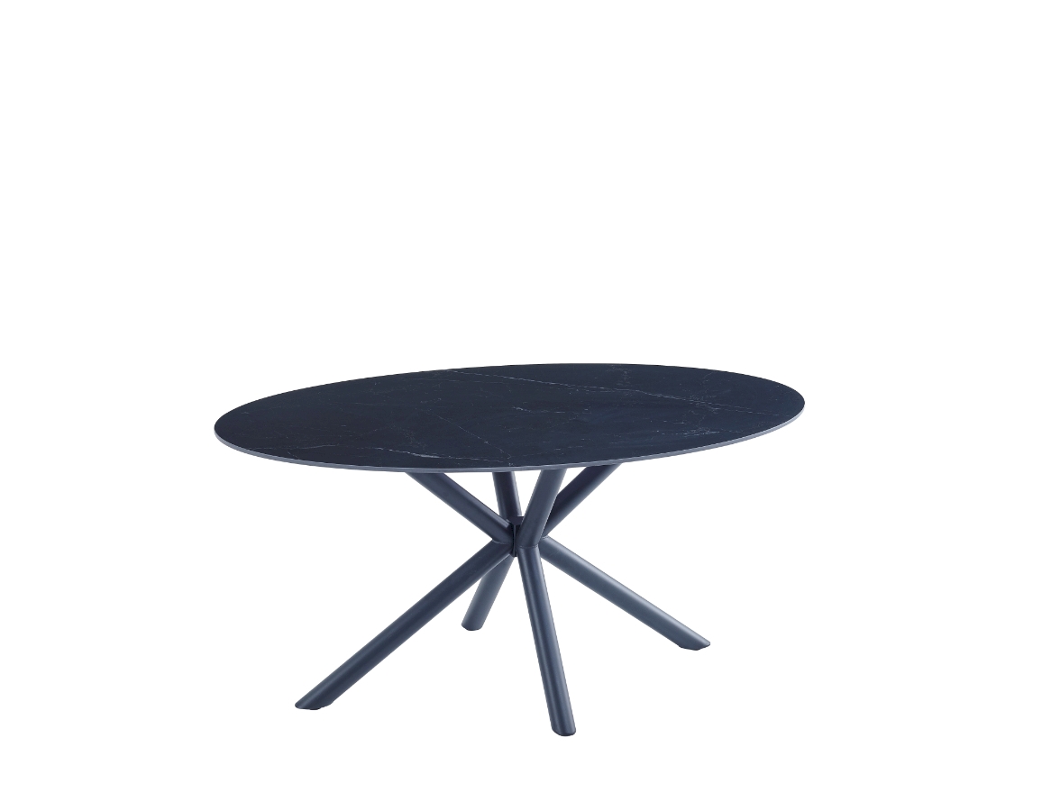 Blagovaonski stol u mat crnoj boji s elegantnim mramornim uzorkom. Ovalna ploča stola u potpunosti je izrađena od sinteriranog kamena debljine 12 mm. Sinterirani kamen dobiva se kombinacijom prirodnog kamena različitih boja te ima niz prednosti u odnosu na klasičnu keramiku. Čvršći je od velikih keramičkih ploča i manje sklon lomljenju. U usporedbi s prirodnim granitnim pločama, prirodno je vodootporan. Osim toga, ekološki je prihvatljiviji od kemijski obrađenih kvarcnih ploča.
