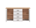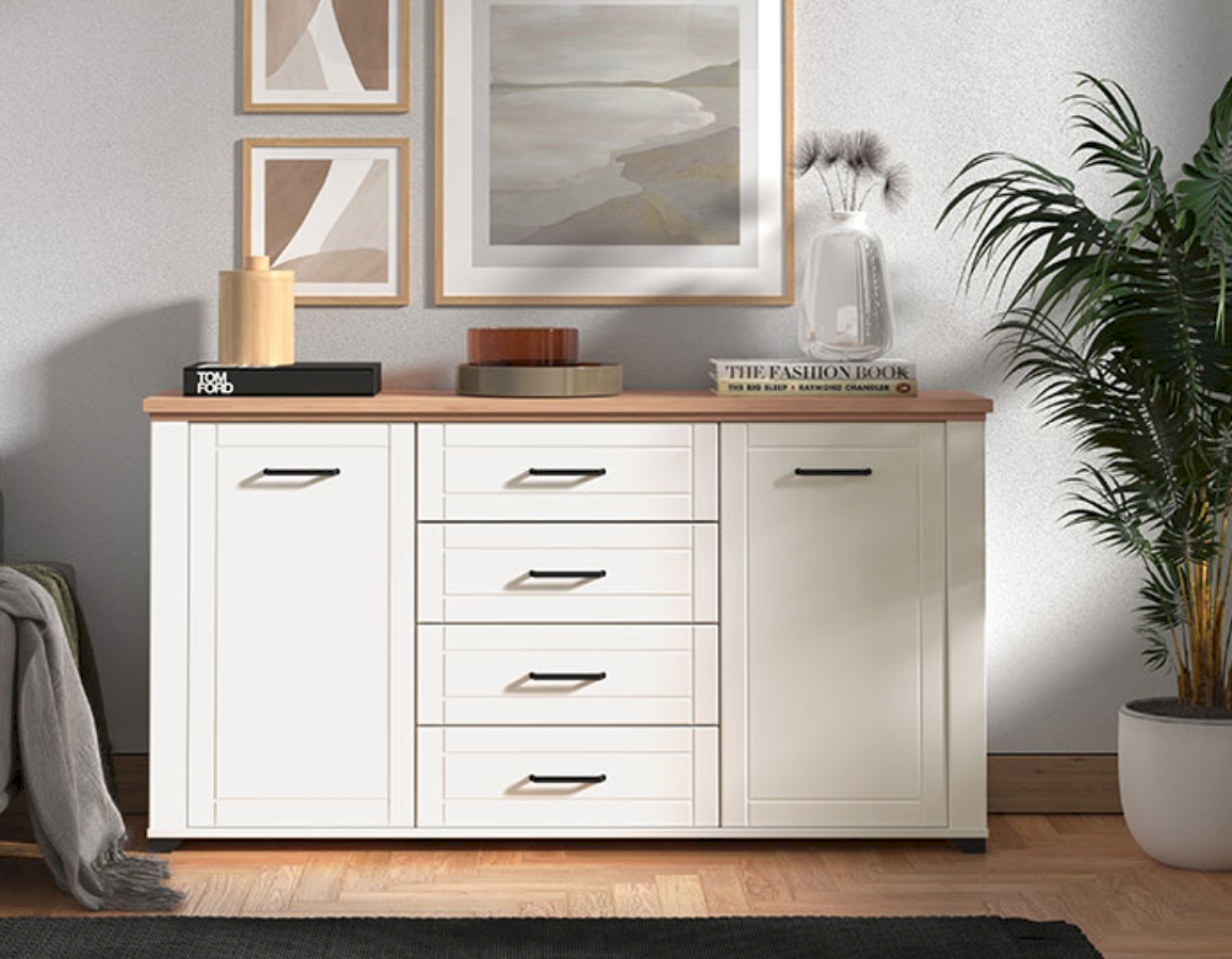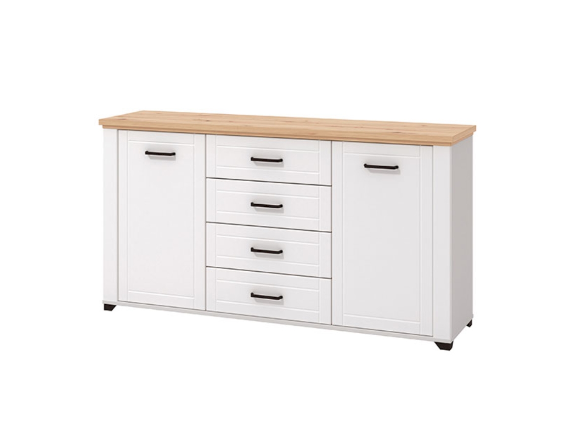 Korisni prostor čine praktične ladice u središnjem dijelu i dva zatvorena dijela koji imaju praktično raspoređene police za odlaganje. Fronte su obogaćene crnim ručkama jednostavnog dizajna koje su usklađene s dizajnerskom linijom cijele kolekcije.