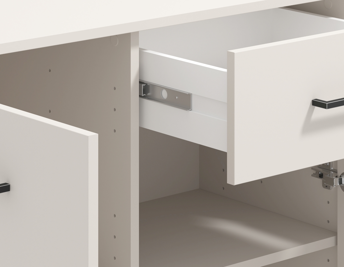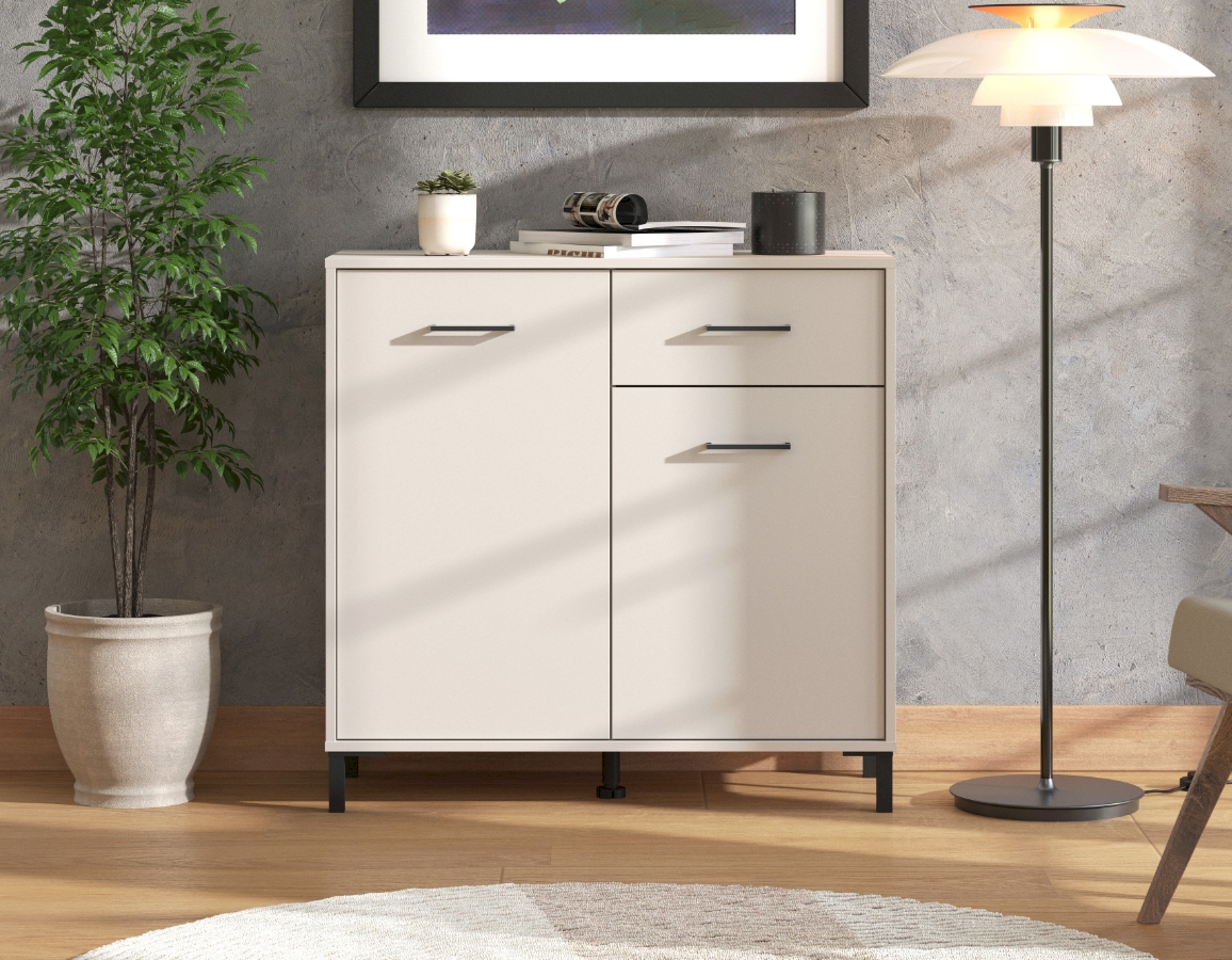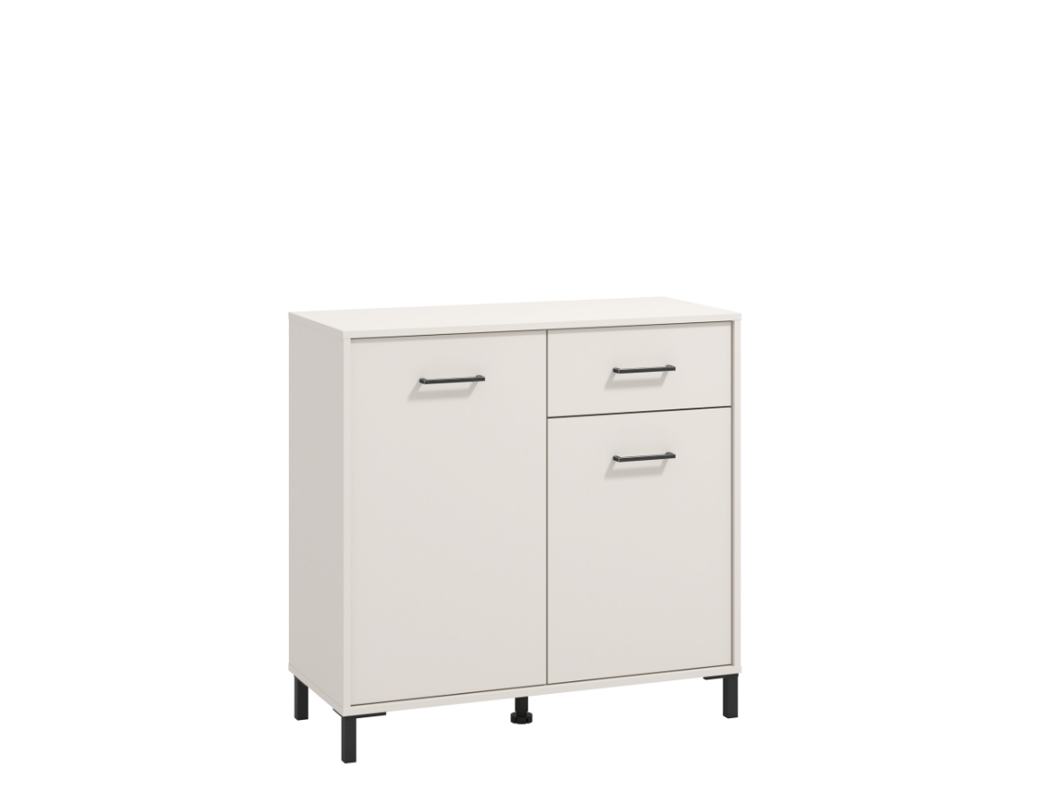 Komoda se sastoji od dva zatvorena dijela s vratima i jednom ladicom.