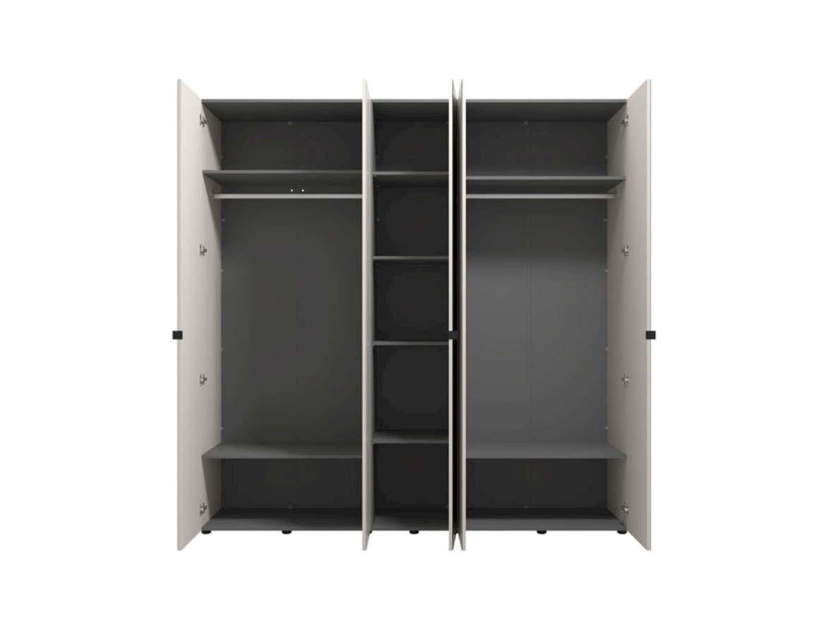 Funkcionalno dizajnersko rješenje za opremanje modernog ambijenta spavaće sobe. Ovaj ormar s pet vrata, s ogledalom u središnjem dijelu, doprinosi izraženoj estetici, eleganciji, ali i praktičnosti ambijenta spavaće sobe. Korisni prostor ovog modela sastoji se od šipki za ormar i pregrada.