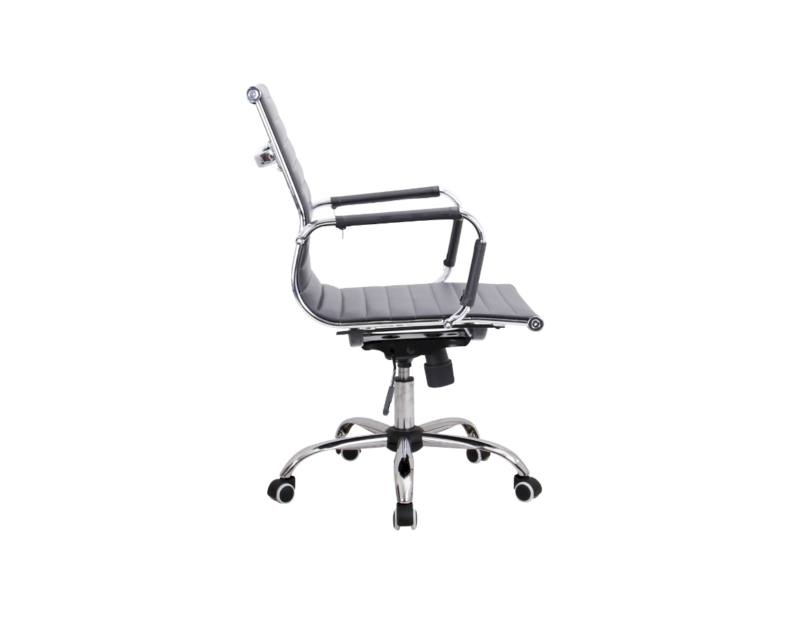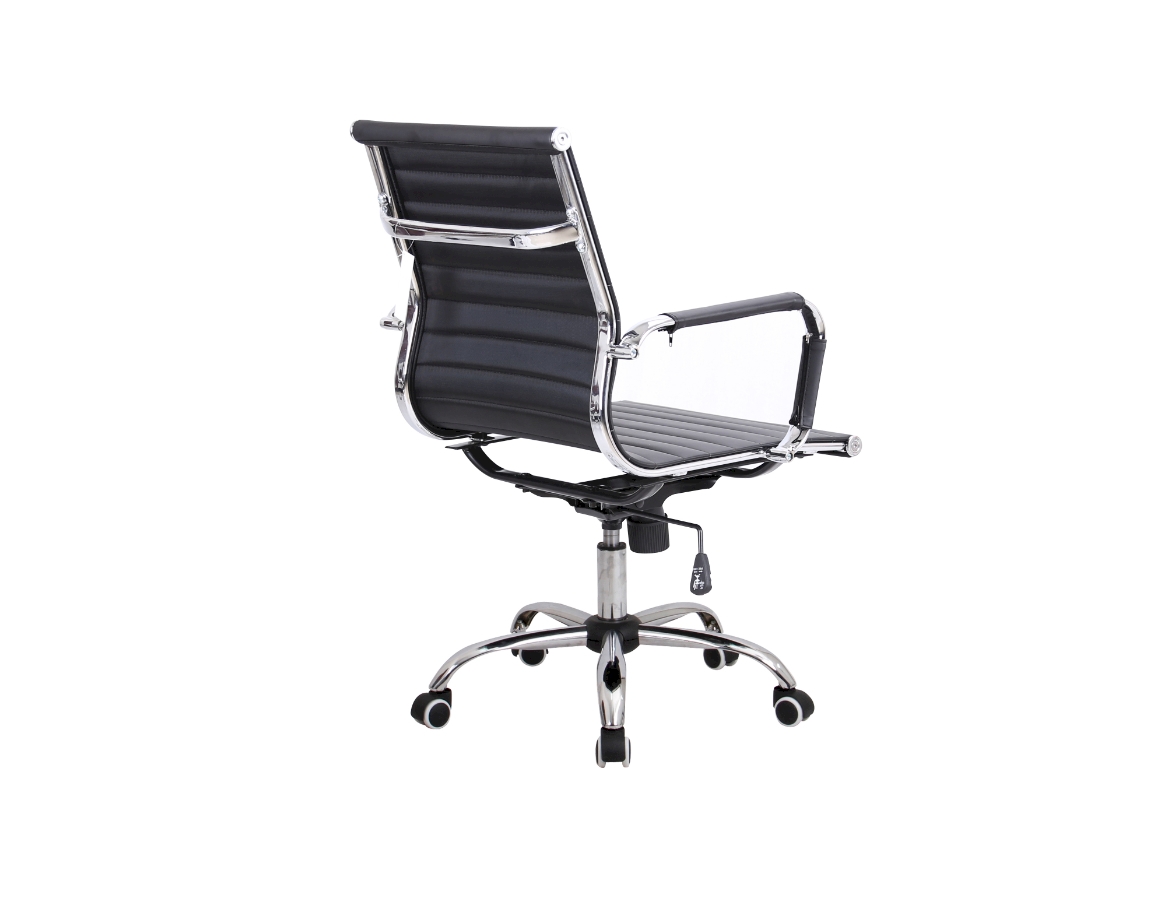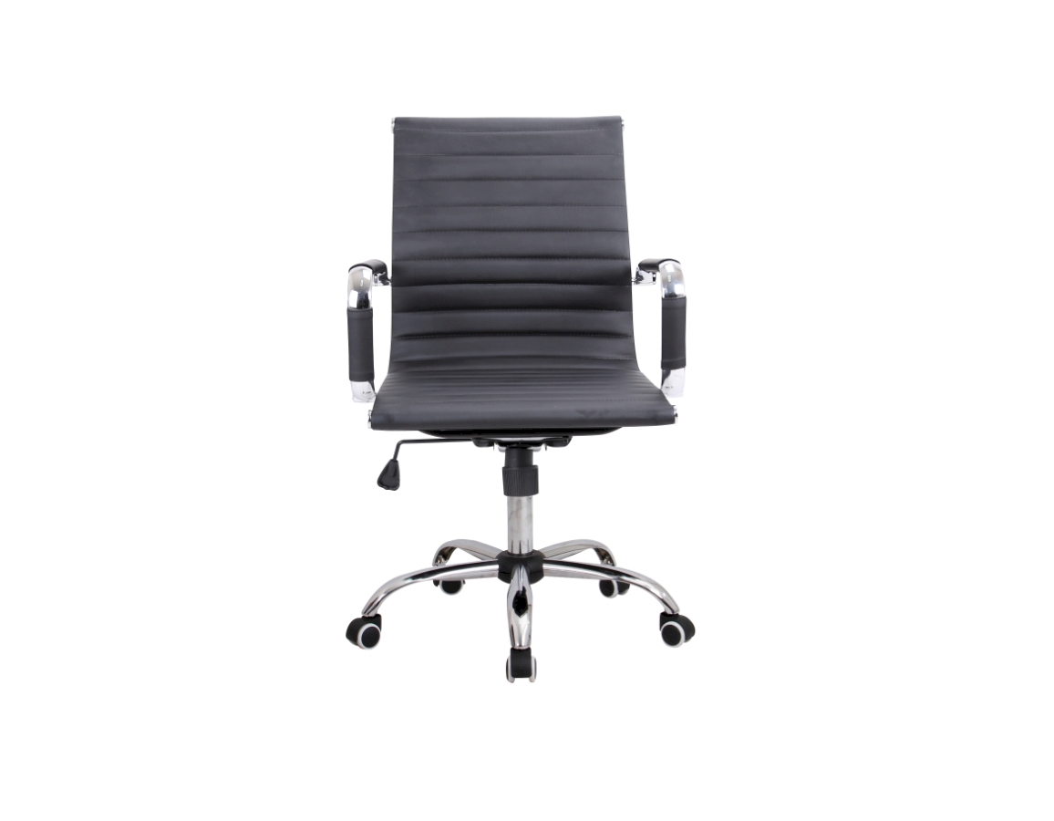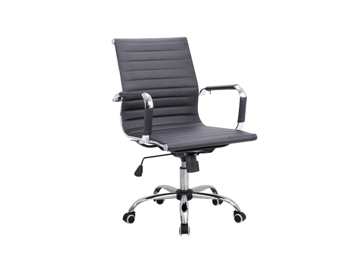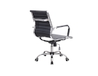 Uredska stolica od umjetne kože s naslonima za ruke. Kromirano postolje i gumeni kotačići.