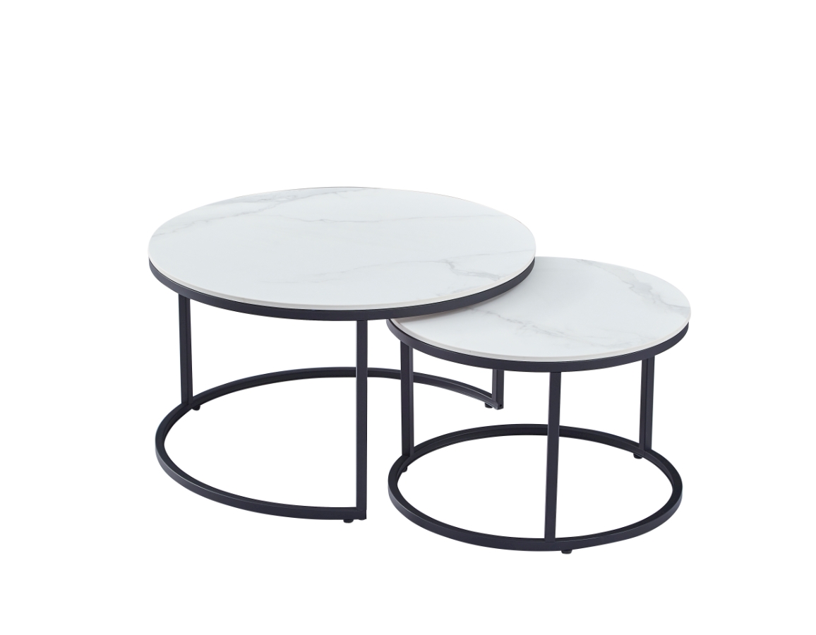 Set od dva okrugla stolića. Ploče stolova izrađene su od sinteriranog kamena s prekrasnim mramornim uzorkom i debljine su 1,2 cm.
